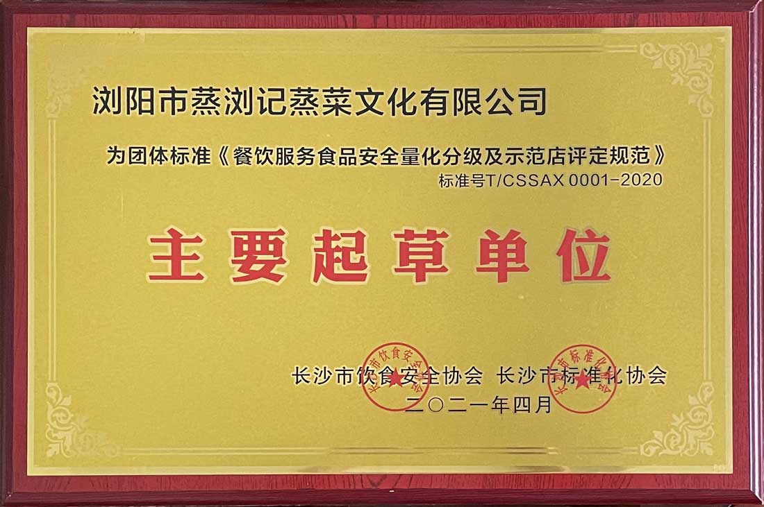 4月16日,作為《餐飲服務食品安全量化分級及示范店評定規范》團體標準主要起草單位,瀏陽蒸菜標準示范品牌——蒸瀏記在長沙市飲食安全協會第五次會員大會暨年度十佳單位表彰大會上接受授牌。