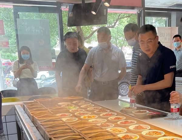 近日,省商務廳黨組副書記譚平率隊調研蒸瀏記,實地查看了蒸瀏記門店運營情況,現場了解蒸瀏記創新研發的全自動瀏陽蒸菜售賣機運行模式,并圍繞企業未來發展、助企紓困舉措落實等方面進行了座談。