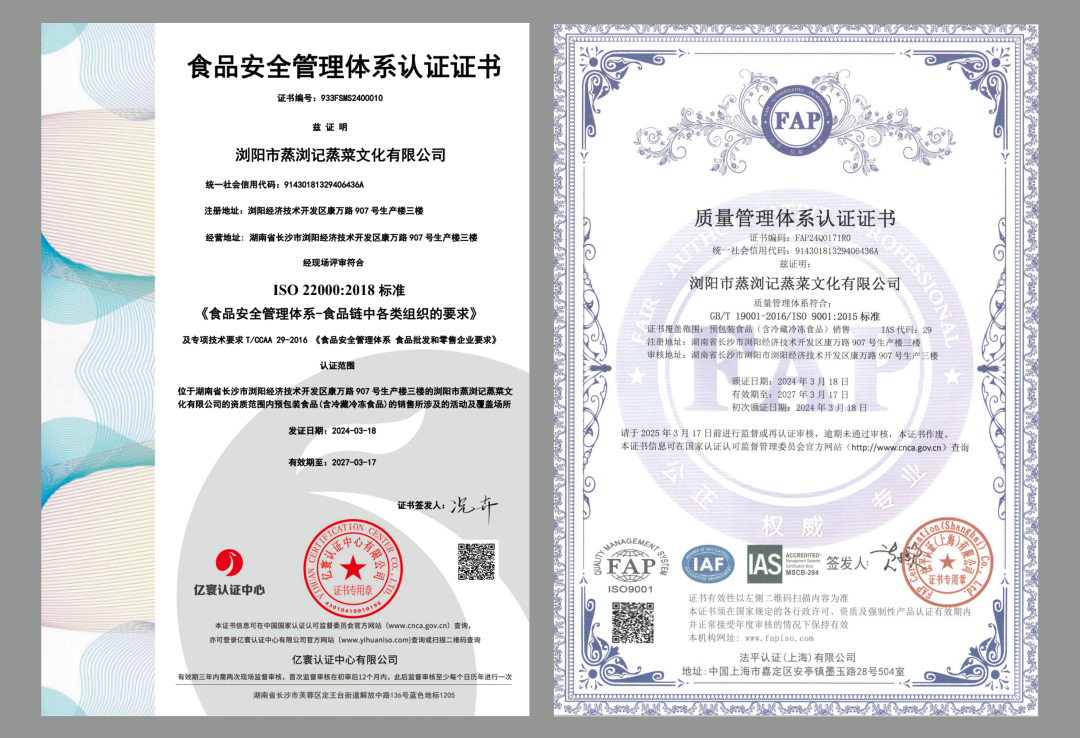 為從源頭上把好食品安全質量關,蒸瀏記中央廚房引入LESS廚房現場管理體系,對標高標準做好食品安全和廚房管理。嚴把“入口關”,所有食品原材料均需要查驗農藥殘留檢測報告和質檢報告;嚴守“流程關”,嚴格落實菜品留樣制度,實現食品安全全流程溯源。今年,蒸瀏記中央廚房順利通過ISO22000食品安全管理體系認證和IS09001質量管理體系認證,并被評定為AAA級信用企業、AAA級立信企業、AAA級誠信供應商、AAA級誠信經營示范單位。