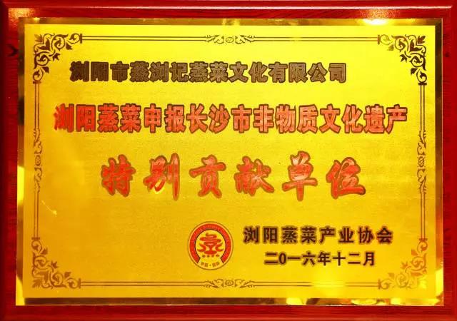 2月15日,2017長沙市非遺保護和傳承座談會召開,會上,瀏陽蒸菜傳統(tǒng)制作技藝等24項新入選的第五批市級非物質(zhì)文化遺產(chǎn)代表性項目被授牌,瀏陽蒸菜產(chǎn)業(yè)協(xié)會會長彭成將牌匾領回瀏陽,蒸瀏記被授予本次非物質(zhì)文化遺產(chǎn)申報的特別貢獻單位。
